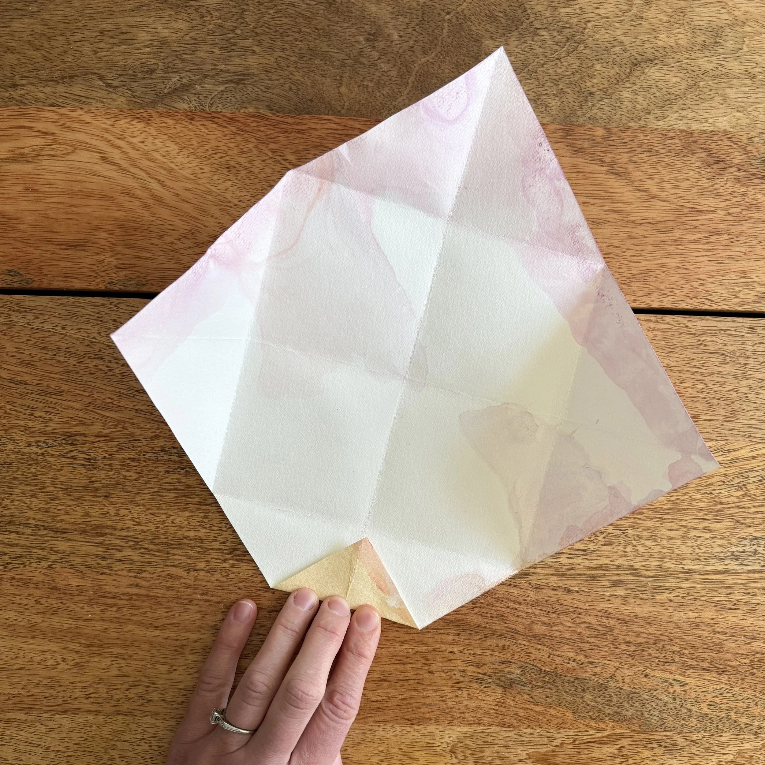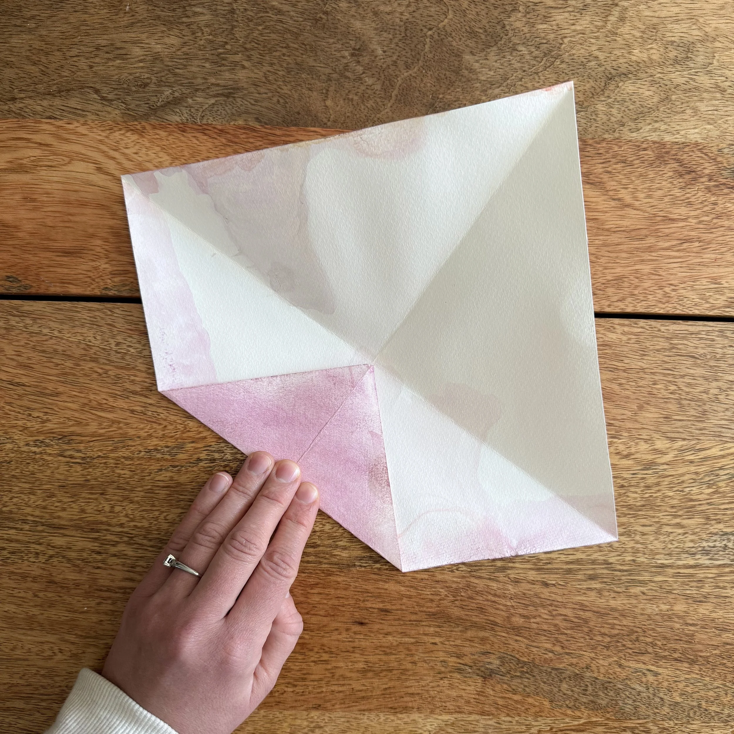 Fold the opposite corners together so the creases intersect in the center of the square.
